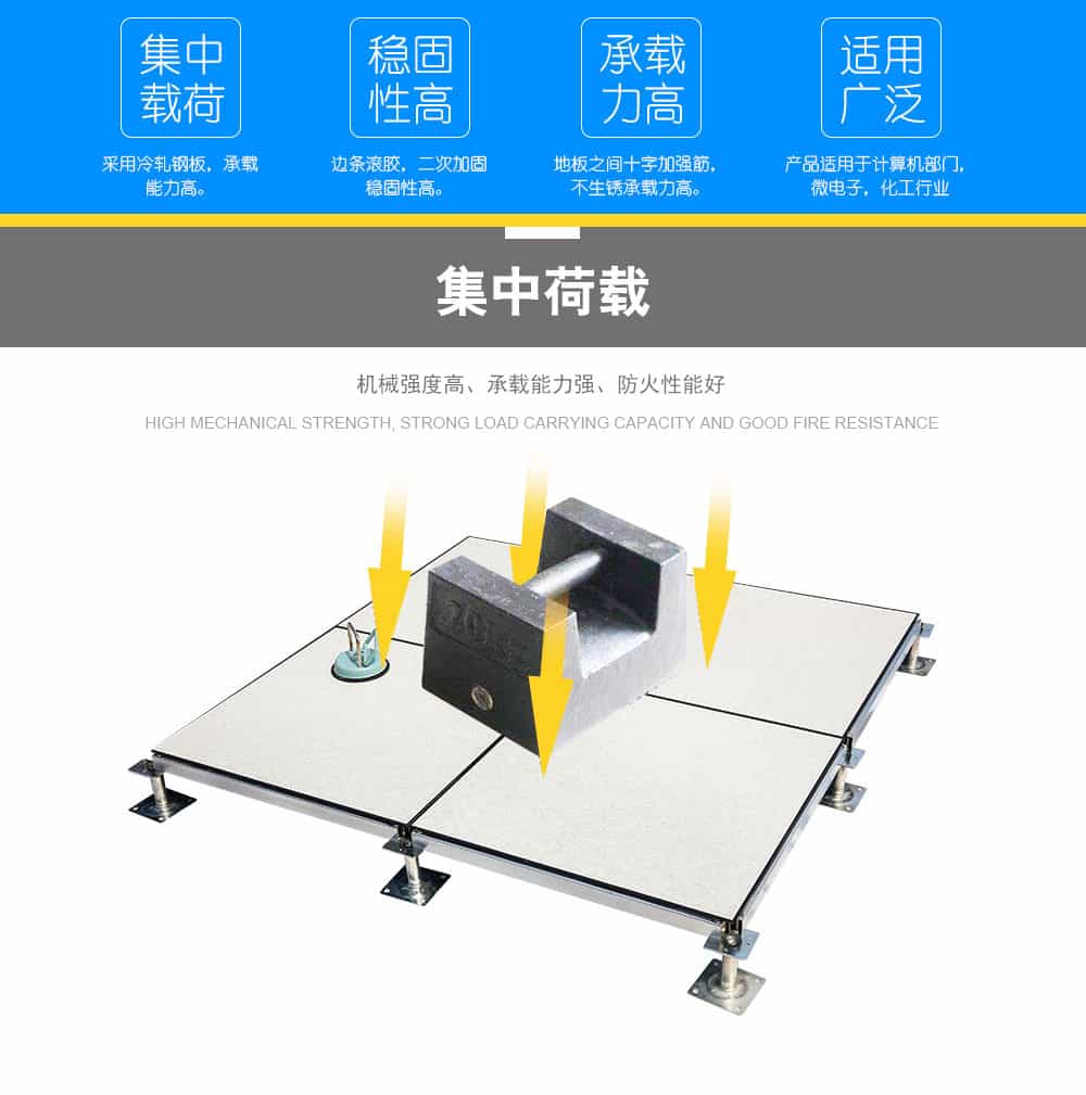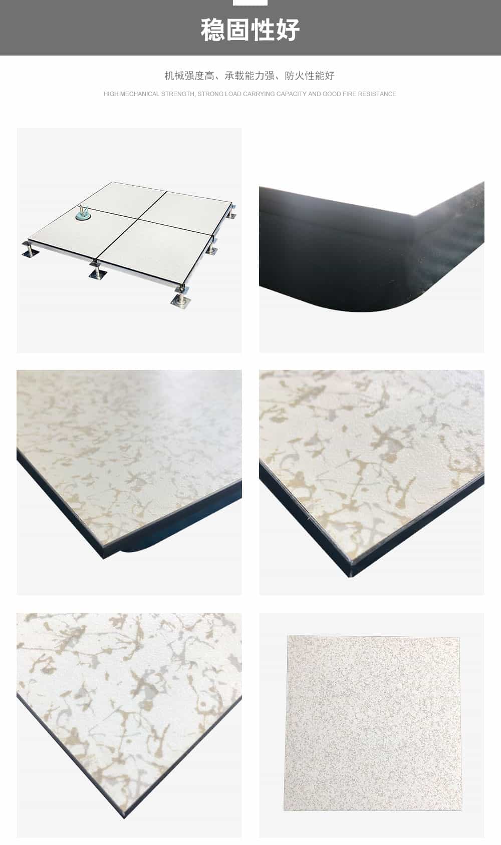 全鋼防靜電地板為全鋼組件,分有邊、無邊、微邊(三種邊處理方式)。底面采用SPCC深沖冷軋板拉伸成型鋼板厚度(0.4~1.5mm),球窩狀結(jié)構(gòu),增加地板的機(jī)械荷載強(qiáng)度。面板采用硬質(zhì)SPCC鋼板(0.5~2.0mm),上下經(jīng)過點(diǎn)焊焊接成型,切邊沖孔后,經(jīng)防銹處理,環(huán)氧樹脂粉末靜電噴涂后,中間填充發(fā)泡水泥(可以根據(jù)客戶需求發(fā)泡不同重量),再經(jīng)過日曬養(yǎng)護(hù)后形成穩(wěn)定的承載結(jié)構(gòu)。地板上表層粘貼防火板(HPL)/復(fù)合PVC/ 通體PVC/陶瓷地磚等不同材質(zhì)的裝飾表層,達(dá)到產(chǎn)品花色的多樣性、可以根據(jù)客戶需求個性化定制產(chǎn)品。搭配聯(lián)網(wǎng)支架、支架、螺釘組裝后,定位聯(lián)接更加準(zhǔn)確、精度可靠。
