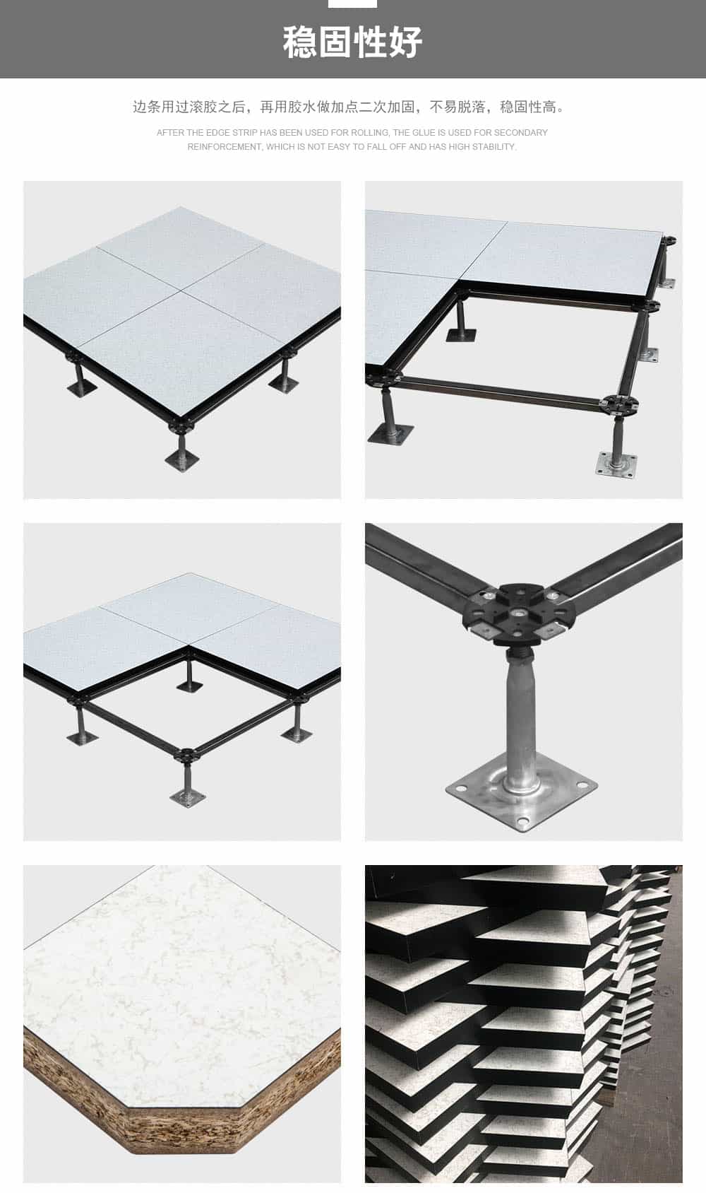 歐式復(fù)合地板,板芯采用、未經(jīng)加工的中高密度刨花板基,上面粘貼HPL(防火板)、PVC、陶瓷、等不同裝飾面層,下面粘貼鍍鋅鋼板/鋁板/鋁箔,四周導(dǎo)靜電黑膠條封邊,阻止機(jī)械損壞及潮濕變形。通過(guò)阻燃劑的添加,使其達(dá)到B1級(jí)防火,且具有較輕的自重,達(dá)到更高的承載能力和環(huán)保水平,標(biāo)配出口型加重配件。